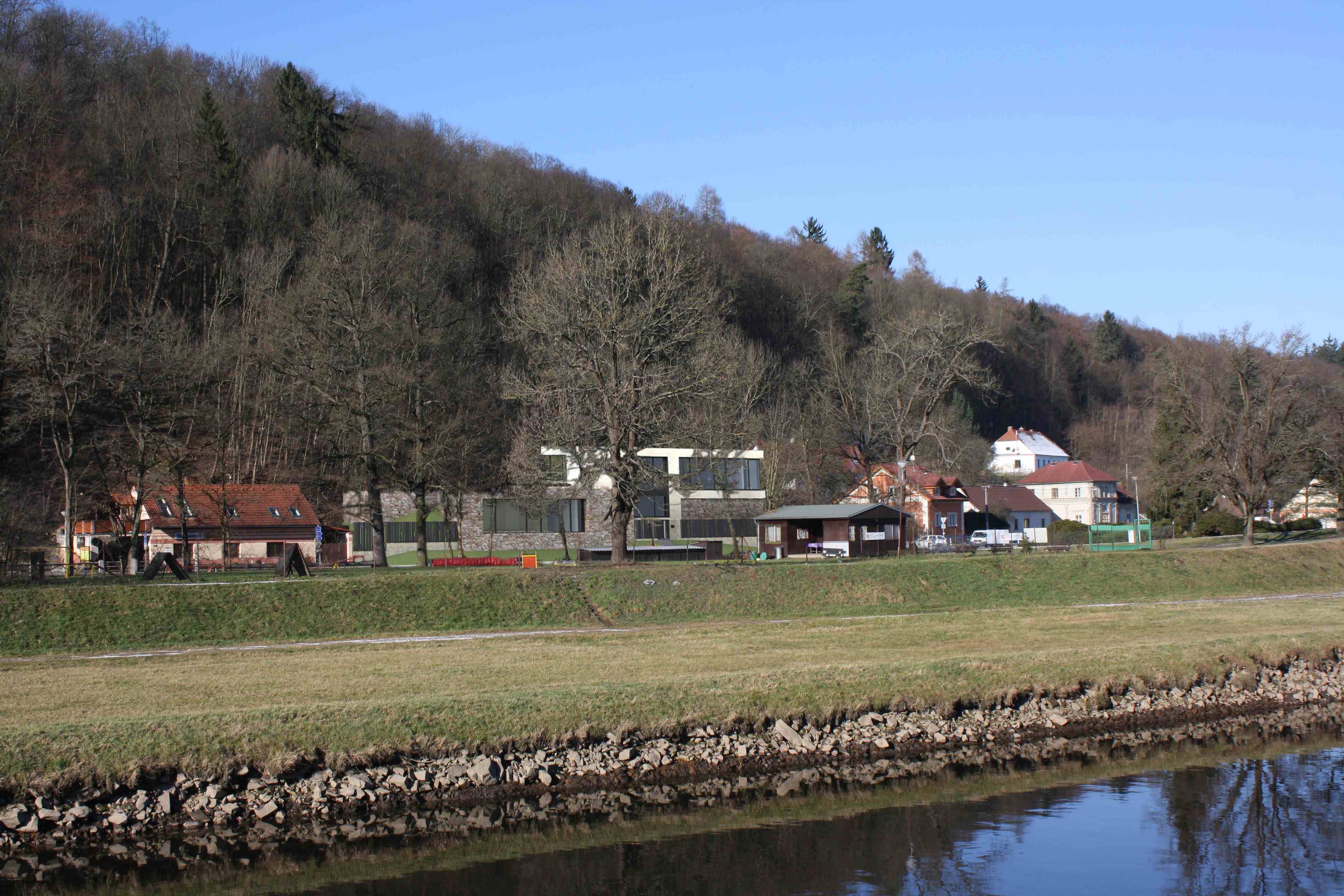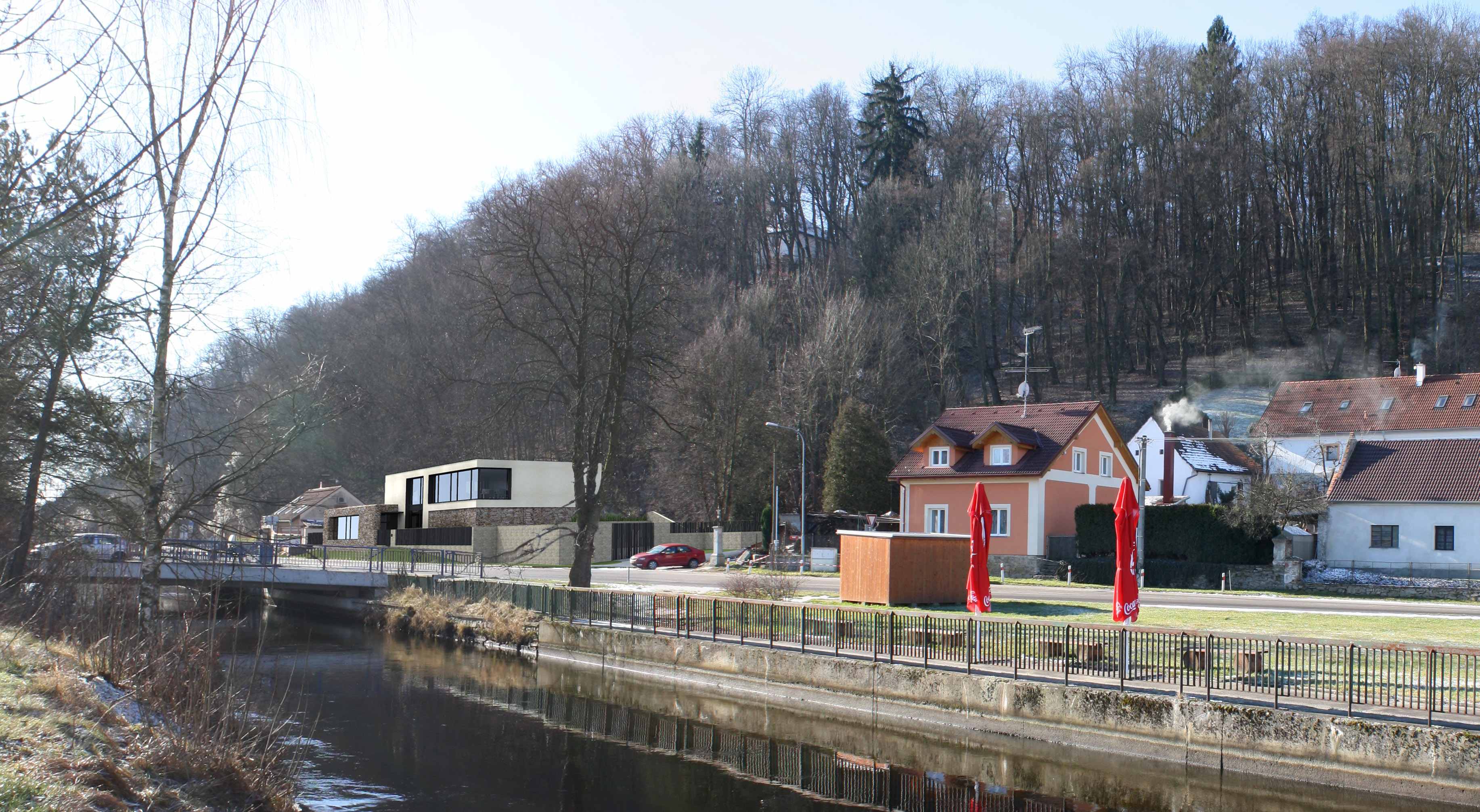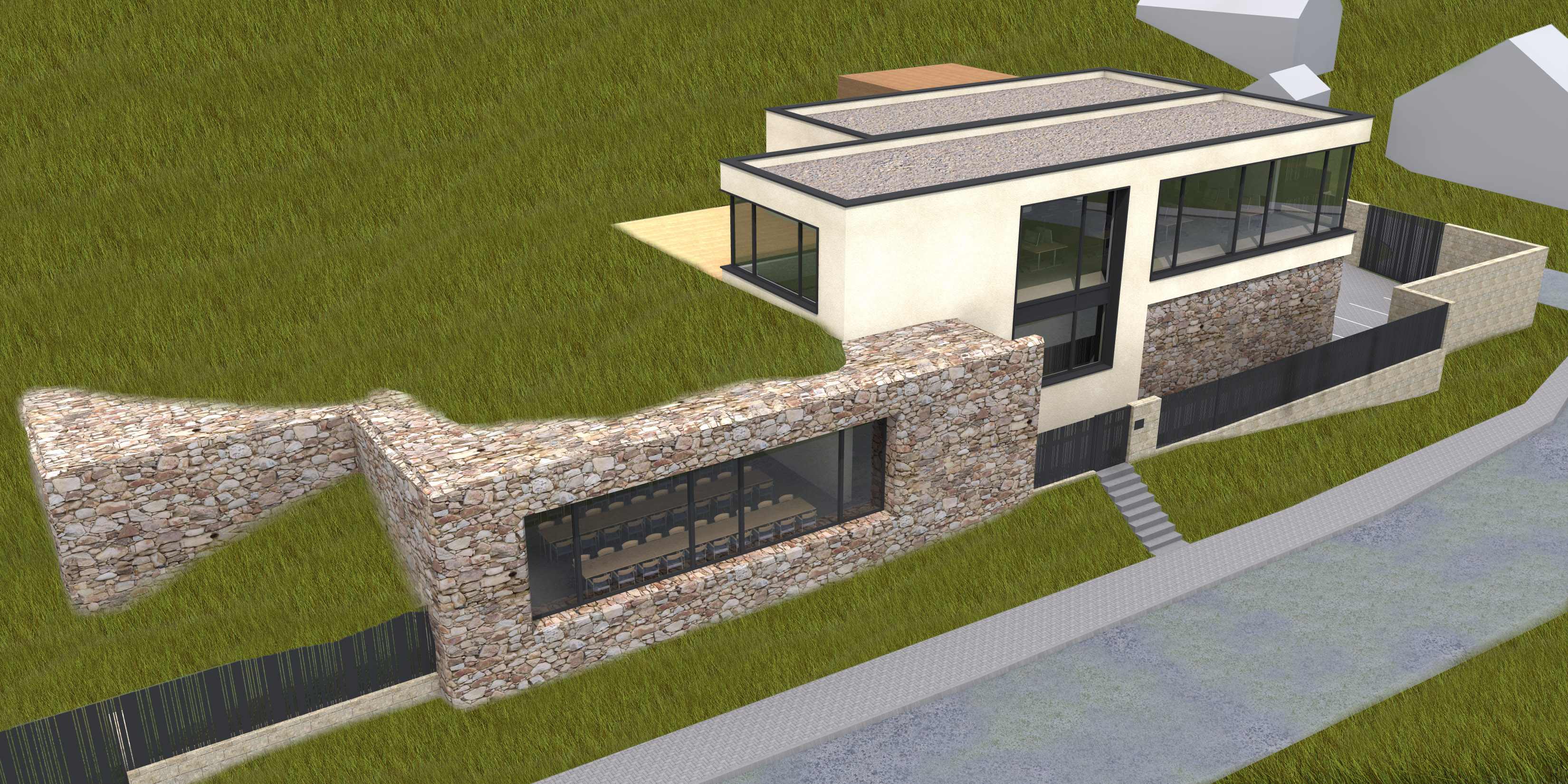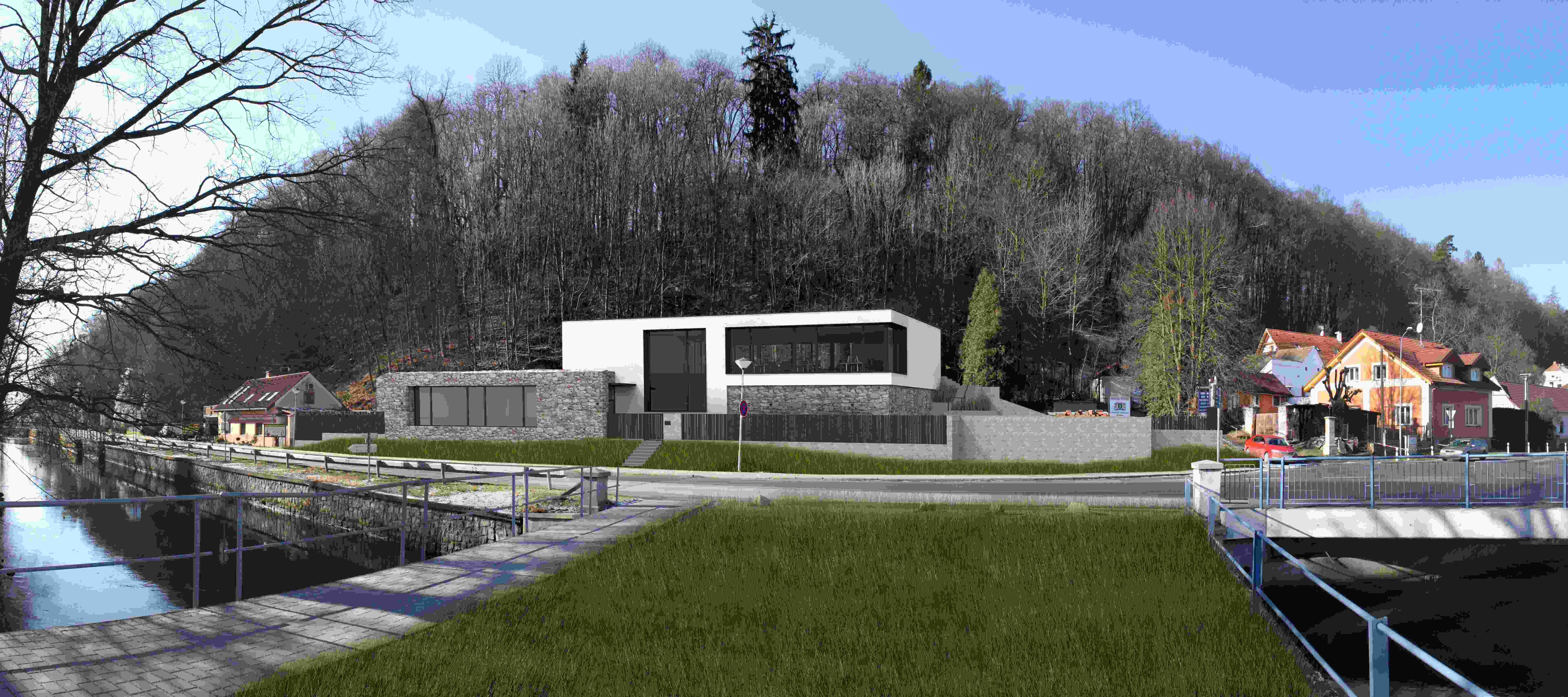 Záměrem stavebníka je vybudování nového administrativního objektu místní firmy s jedním a částečně ustupujícím druhým podlažím. V historii byly odstraněny původní objekty, po kterých zůstaly pouze zbytky opěrných stěn. Vzhledem k jejich nestabilitě padlo rozhodnutí zajistit svah přímo novými konstrukcemi stavby. Opticky se toto řešení projevilo na jednopodlažní části stavby, která je vklíněna do stávajícího svahu, který se plynule přelívá na jeho střechu. Svah není nahrazen kultivovanou zelenou střechou, ale cíleně nechává prorůst zeleň s břečťanem i na řešený pozemek. Část tohoto podlaží, které nepohltil svah je pojednán přírodním lomovým kamenem na fasádě, který má evokovat vyčnívající skálu. Druhá dvoupodlažní hmota objektu je propojena s podzemní zasypanou částí, ve které je umísten hlavní vstup. Zastřešení je zvoleno plochou střechou, která nezvyšuje stavbu o šikmou část, která je pro tuto funkci nevyužitelná.